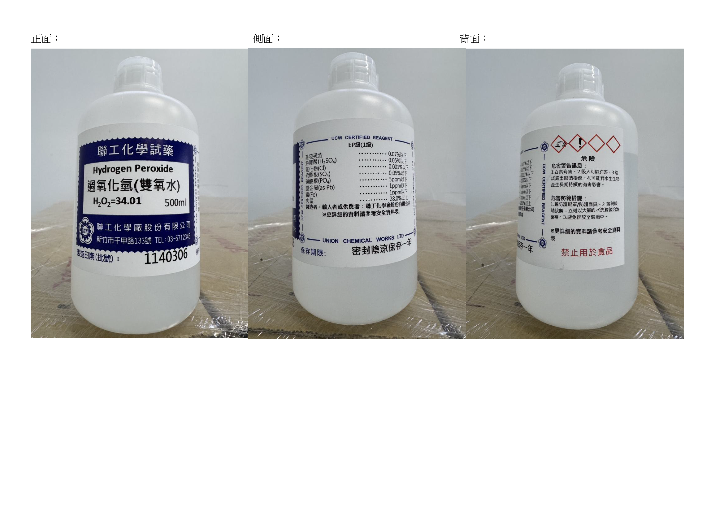 | 82303 | Hydrogen Peroxide 過氧化氫(雙氧水) | EP | 500mL(555g)塑膠瓶 | ||||||||||||||||||||